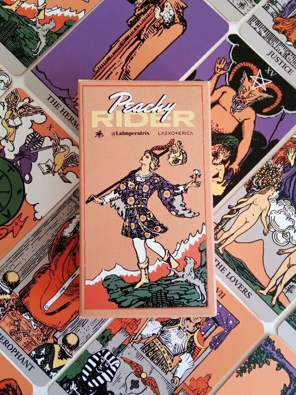 Las 78 cartas del Rider Waite Smith sin bordes recoloreadas en clave Peachy. Un mazo único con el toque mágico de nuestra diseñadora estrella, esos colores no pueden no enamorarte!